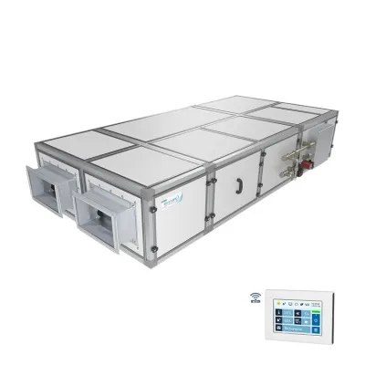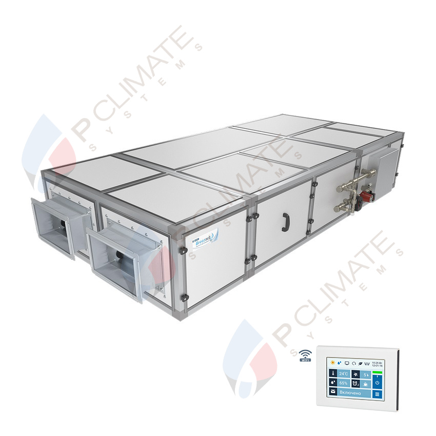 Подвесная приточно-вытяжная установка с пластинчатым рекуператором (с системой защиты от замерзания, эффективная работа до -35°С), водяным нагревателем и смесительным узлом с 2-х или 3-х ходовым клапаном (узел подбирается исходя из типа водоснабжения). Комплектуется воздушными клапанами с электроприводом (с возвратной пружиной), системой цифровой автоматики JetLogic с цветным сенсорным пультом управления и всеми необходимыми датчиками. Вентиляторы Ebmpapst серии EC (произведены в Германии).