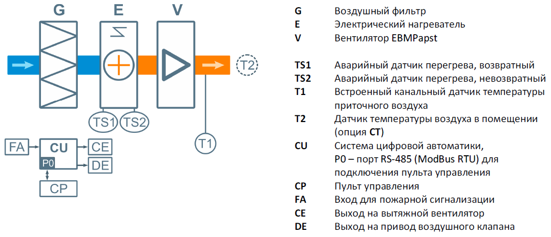 - Плавная регулировка мощности калорифера для нагрева воздуха до заданной температуры, защита от перегрева.